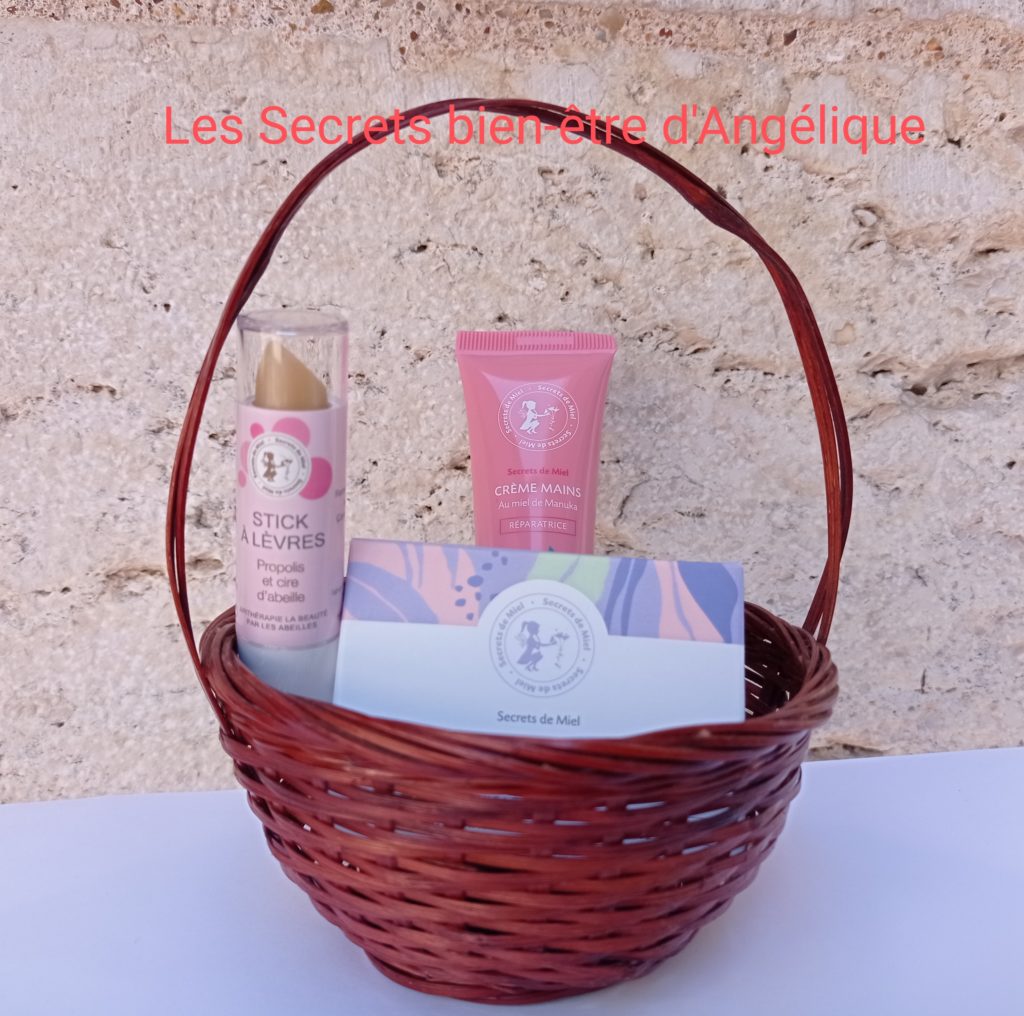 Petit panier composé d'un stick à lèvres, une crème mains et un démaquillant