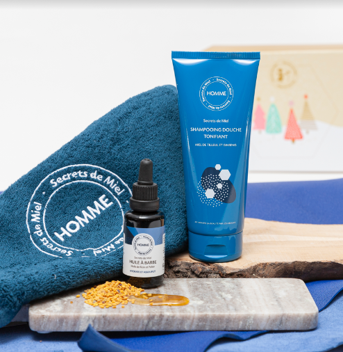 Coffret 100% masculin : un gel douche tonifiant, une huile à barbe et une petite serviette éponge